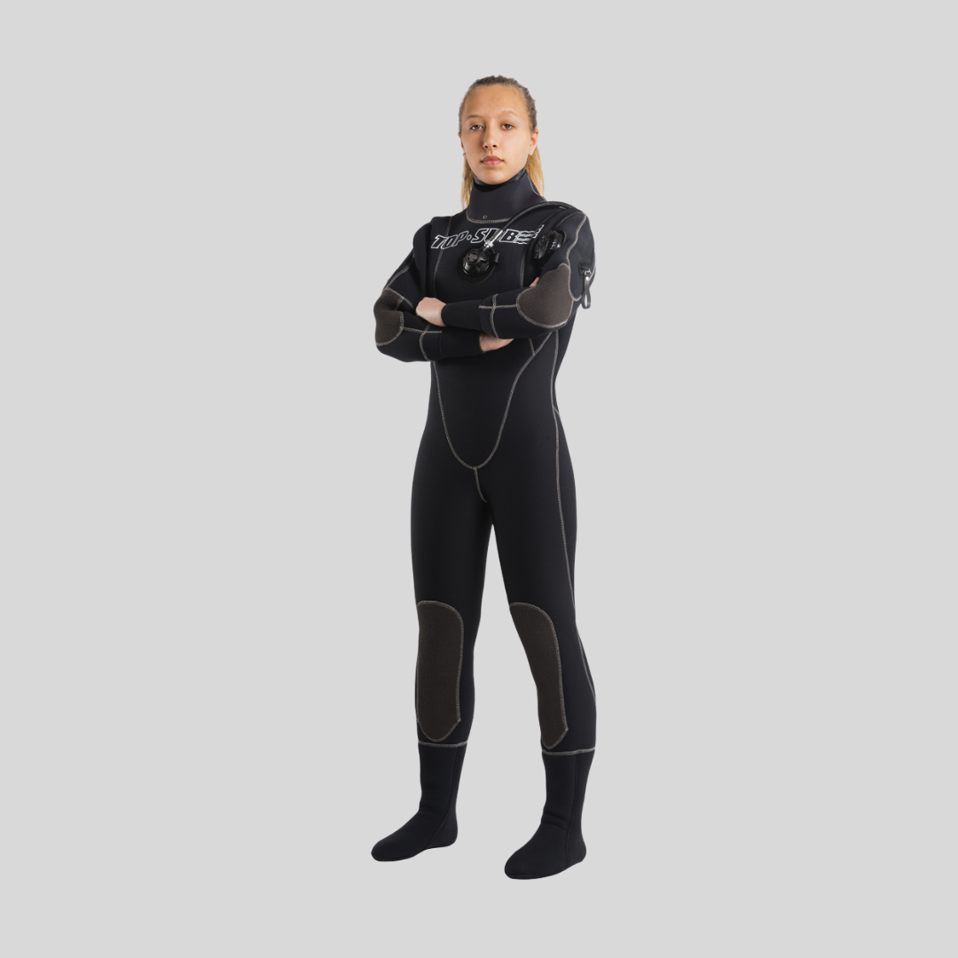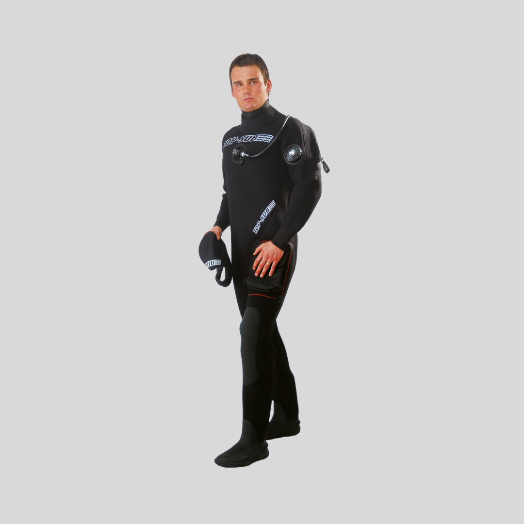 Comodo monopezzo stagno in neoprene HD (alta densità) realizzato su misura o di taglia per uomo e donna. Fodera esterna antitaglio, disponibile in nero o rosso alta visibilità. Stivale rigido rinforzato da cantiere.